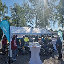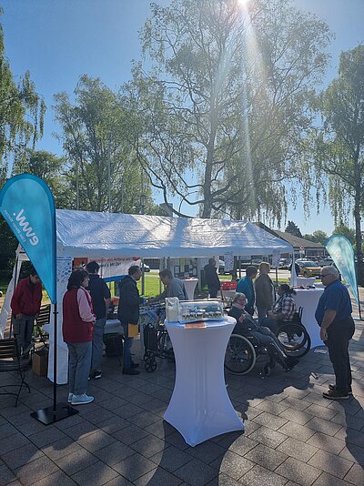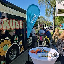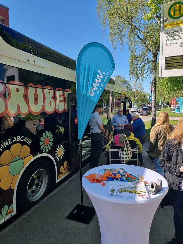 Die Elbe-Weser Welten gGmbH und Bremerhaven Bus präsentierten sich auf dem Leherheider Wochenmarkt und boten ein Bustraining für Menschen mit Mobilitätseinschränkungen an.