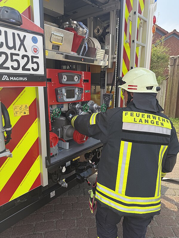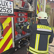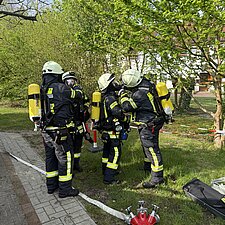 Kurz darauf trafen die Einsatzkräfte der Freiwilligen Feuerwehr Langen ein. Mit voller Ausrüstung begaben sie sich ins Gebäude, suchten nach einer vermissten Person und begannen mit den Lösch- und Belüftungsmaßnahmen. Für die Feuerwehr selbst war diese Übung eine gute Gelegenheit, das Objekt besser kennenzulernen und die Zusammenarbeit mit dem Kindergarten zu vertiefen.