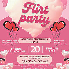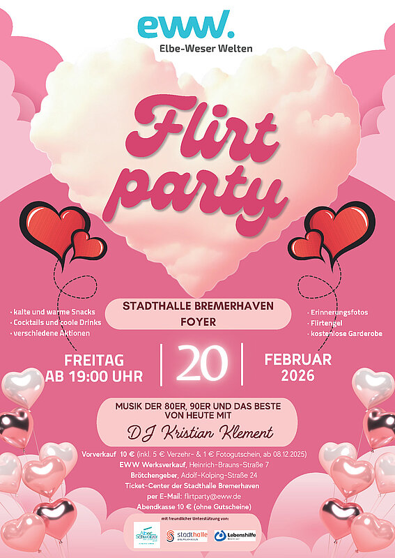 Es liegt Liebe in der Luft! Am 20. Februar 2026 verwandelt sich das Foyer der Stadthalle Bremerhaven ab 19:00 Uhr erneut in einen Ort voller Lachen, Tanz und aufregender Begegnungen. Die 12. Flirtparty der Elbe-Weser Welten, ein Event mit Kultstatus, lädt Menschen mit Behinderungen und ihre Freunde ein, einen unvergesslichen Abend voller Musik, Genuss und besonderer Begegnungen zu erleben.