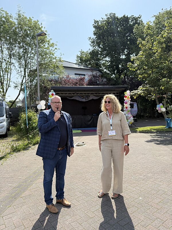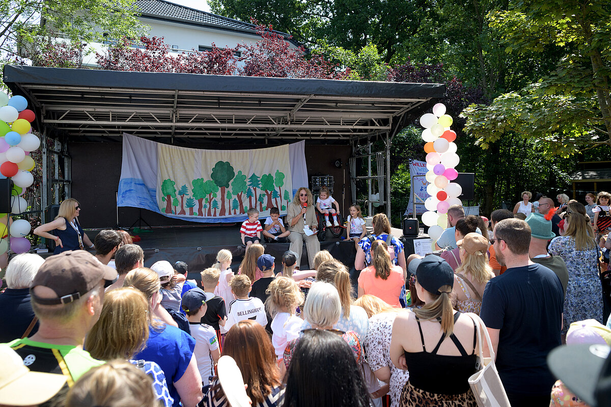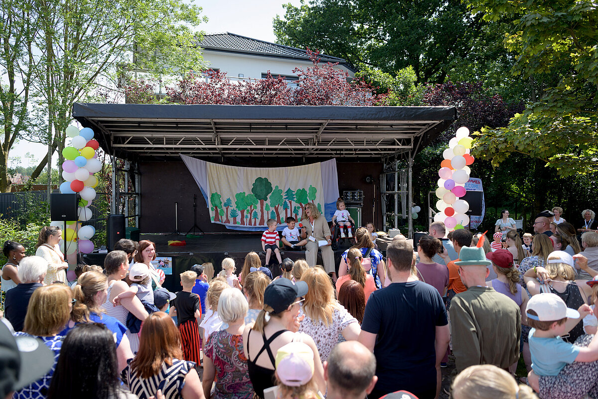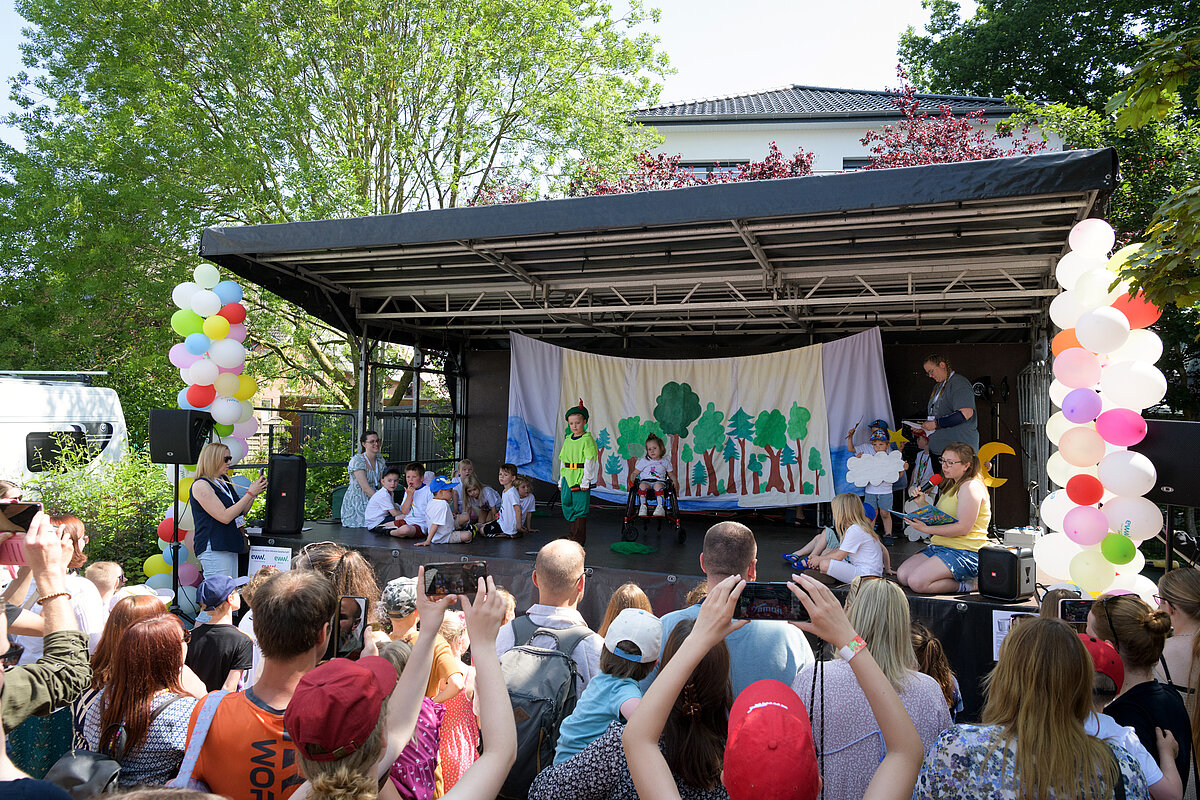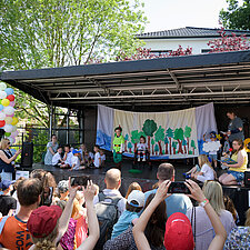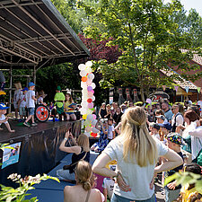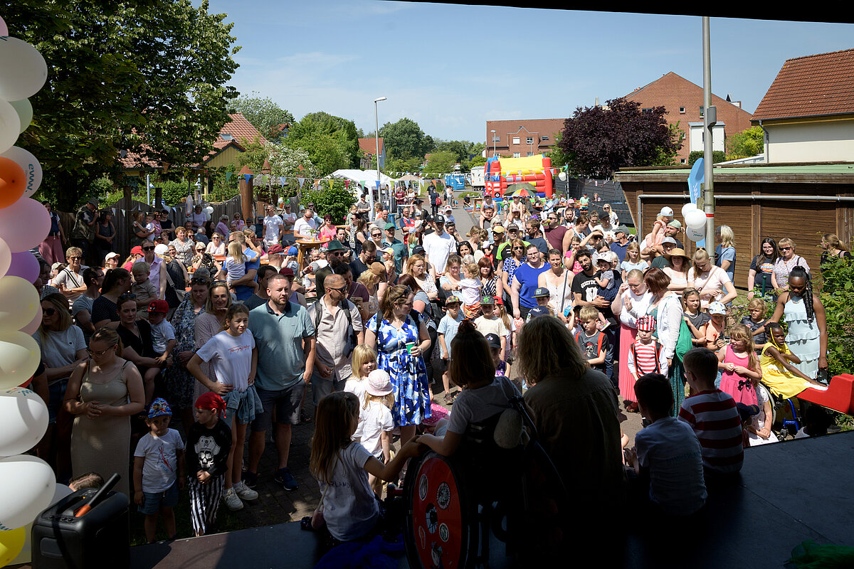 Um 12:00 Uhr eröffnete Angelika Oest feierlich das Fest – gemeinsam mit einigen Kindern der Kita. In ihrer Begrüßung bedankte sie sich herzlich bei den Anwohner*innen des Weißdornwegs für die großartige Unterstützung und die Bereitschaft, die Straße für das Fest zu sperren. Die Straße war festlich geschmückt und wurde zur Bühne für gelebte Inklusion.