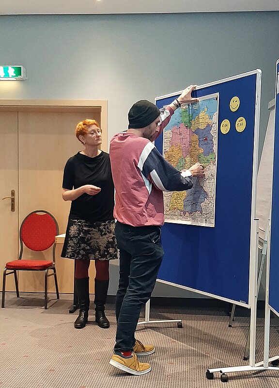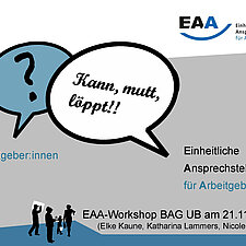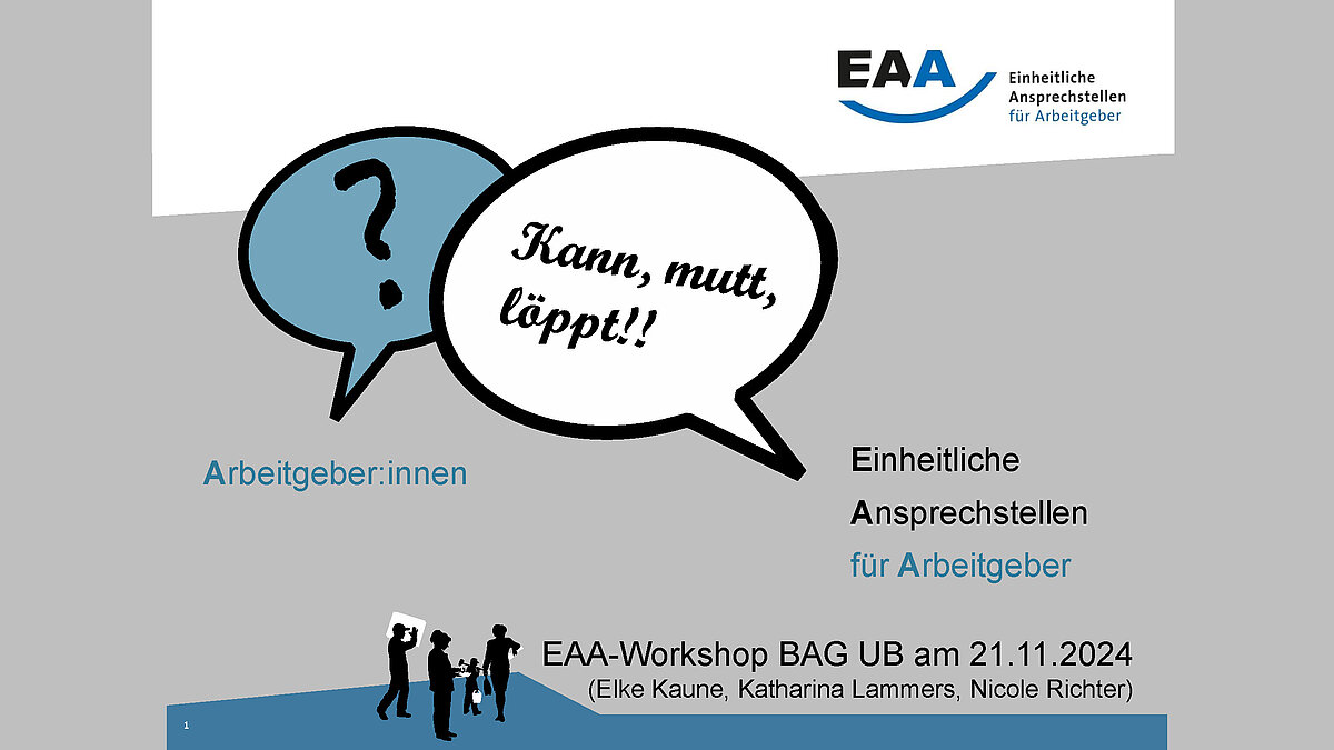 Bei der Jahrestagung der BAG UB in Suhl haben sich die Einheitlichen Ansprechstellen für Arbeitgeber (EAA) aus Bremen und Bremerhaven vorgestellt und über ihre Arbeitsweise berichtet. An dem Workshop haben Katharina Lammers (EAA Bremen), Elke Kaune (EAA Bremerhaven) und Nicole Richter (IFD Bremerhaven/Wesermünde) teilgenommen. Gemeinsam mit den etwa 20 Teilnehmenden des Workshops aus ganz Deutschland gab es einen tollen Austausch über Gemeinsamkeiten und Unterschiede der einzelnen EAAs und Schnittstellen zu IFD und anderen Einrichtungen sowie Unternehmen.