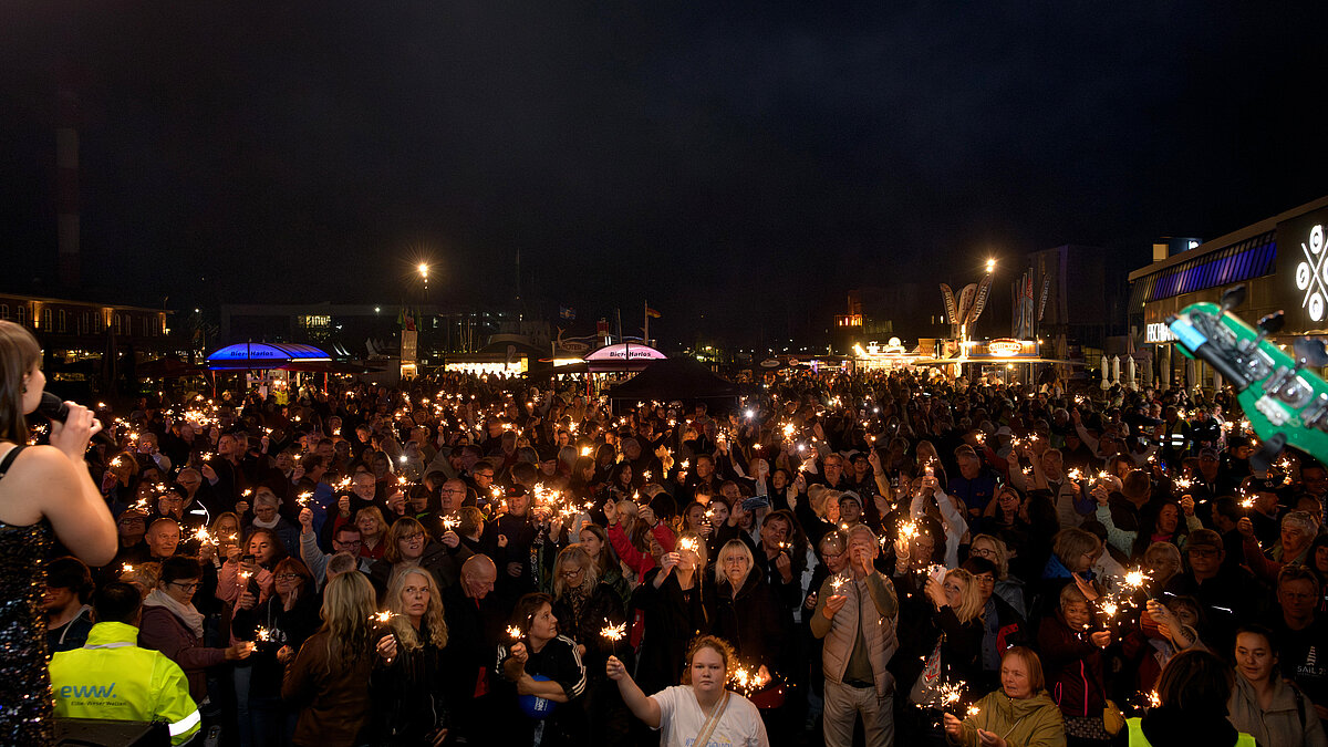 Ein besonderer Höhepunkt des Abends war das große Abschlussbild mit Wunderkerzen: Jede Besucherin und jeder Besucher erhielt Wunderkerzen, sodass zum Finale ein funkelndes Lichtermeer entstand, das den Fischereihafen in eine ganz besondere Atmosphäre tauchte.