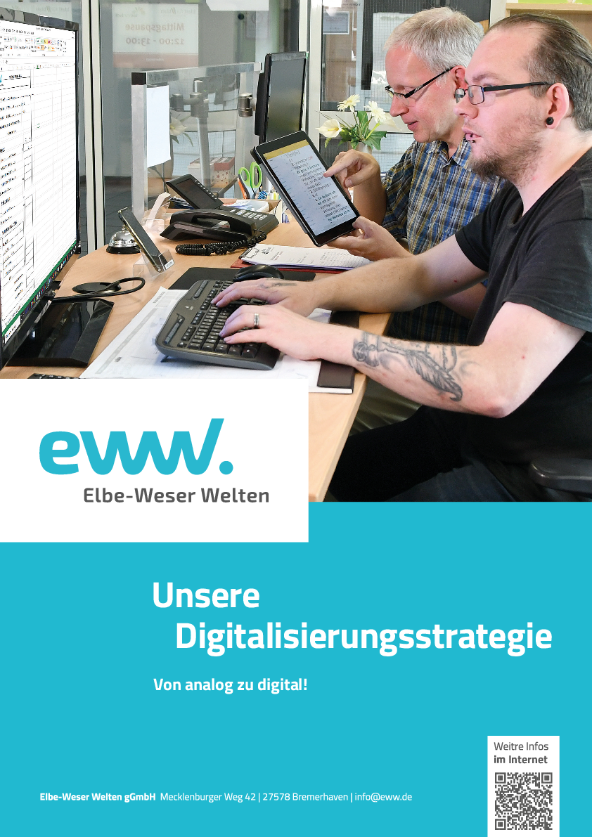 Der digitale Wandel wird die Gesellschaft und die Arbeitswelt weiter formen und die Abläufe, Prozesse, Kommunikation und Leistungserbringung in den Elbe-Weser Welten verändern. Wir sind der festen Überzeugung, dass sich dadurch neue Aufgaben, Angebote und Aufträge entwickeln, die dazu dienen, unserem gemeinsamen Ziel, einer gleichberechtigten Teilhabe aller in der Gesellschaft näherzukommen.